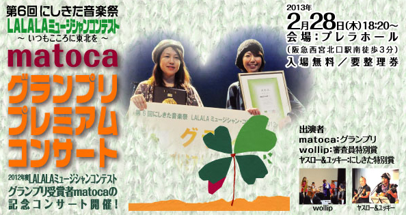 ◆主 催:西北活性化協議会 [(協)アクタ西宮振興会、にしきた商店街、兵庫県立芸術文化センター、阪急 西宮ガーデンズ] ◆共 催: 財団法人兵庫県芸術文化協会、兵庫県地域文化団体協議会、 阪神南文化振興団体連絡協議会、にしきた街舞台実行委員会 ◆協 力: 78.7MHzさくらFM、ガラス工房やまむら ◆後 援: 兵庫県 ◆兵庫県阪神南県民局 「平成24年度 阪神南地域イメージアップイベント開催支援事業」 ◆西宮市協働事業提案(地域文化芸術振興部門)採択事業 ◆お問合せ: 西北活性化協議会 LALALAミュージシャンコンテスト事務局 TEL:0798-61-3226 URL:http://www.nkrk.org E-mail:info@nkrk.org